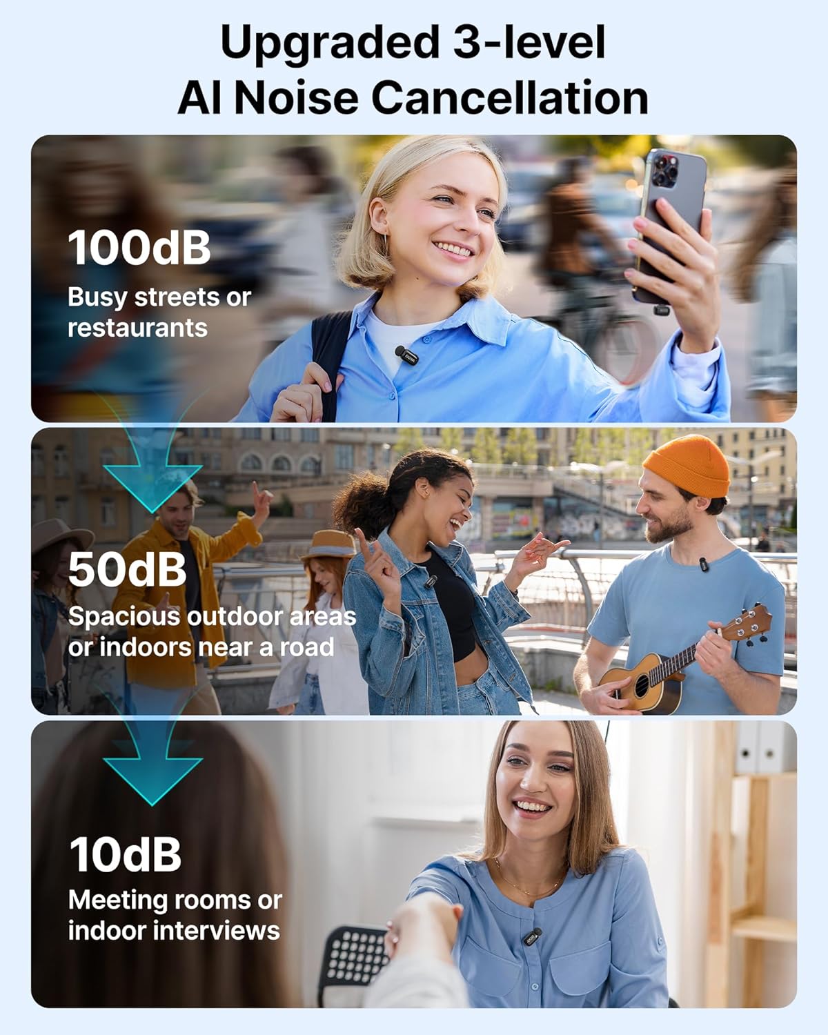 إلغاء ضوضاء ذكي بـ 3 مستويات (AI Noise Cancellation): يخلّي صوتك صافي وواضح حتى بالشارع أو أماكن مزدحمة.